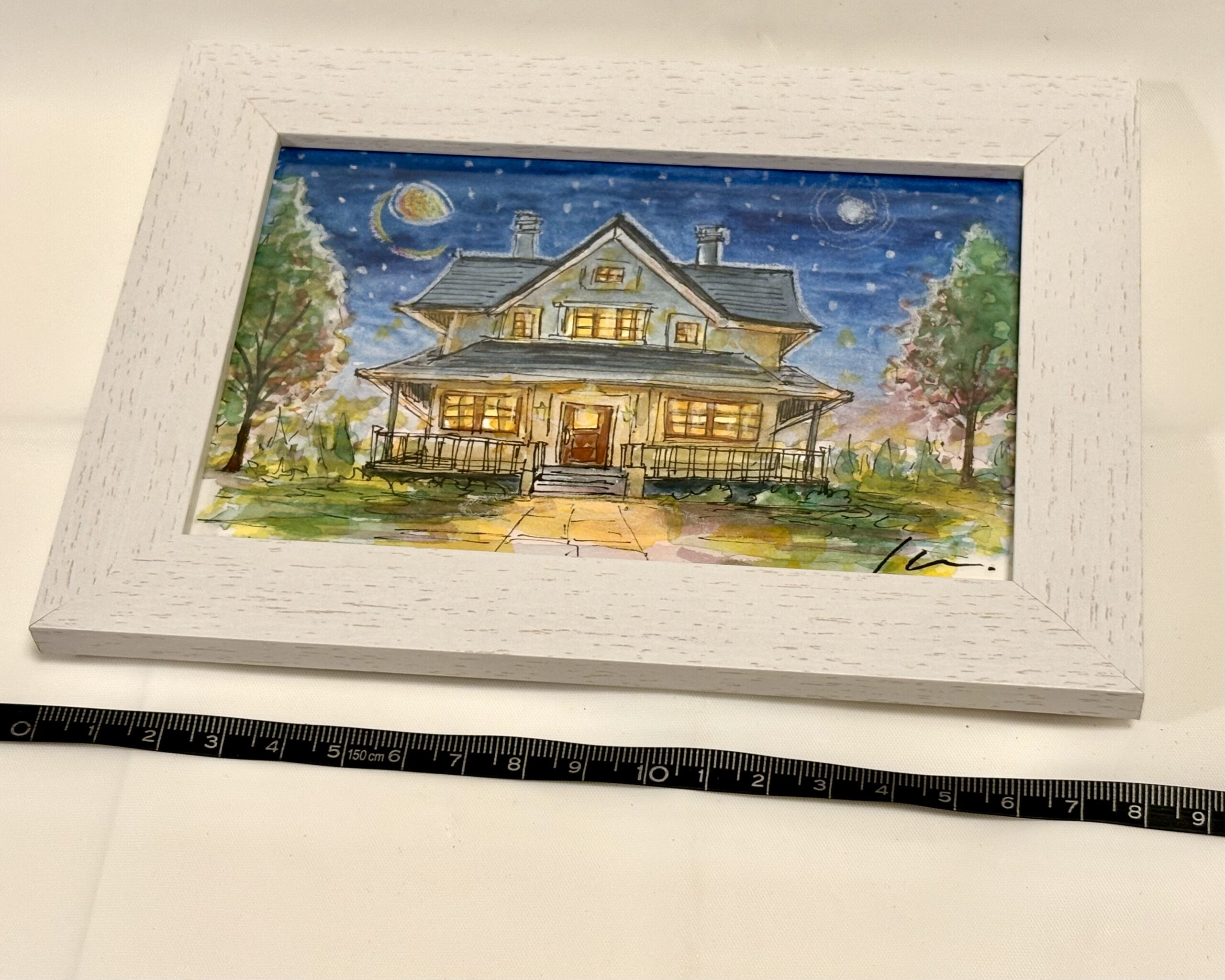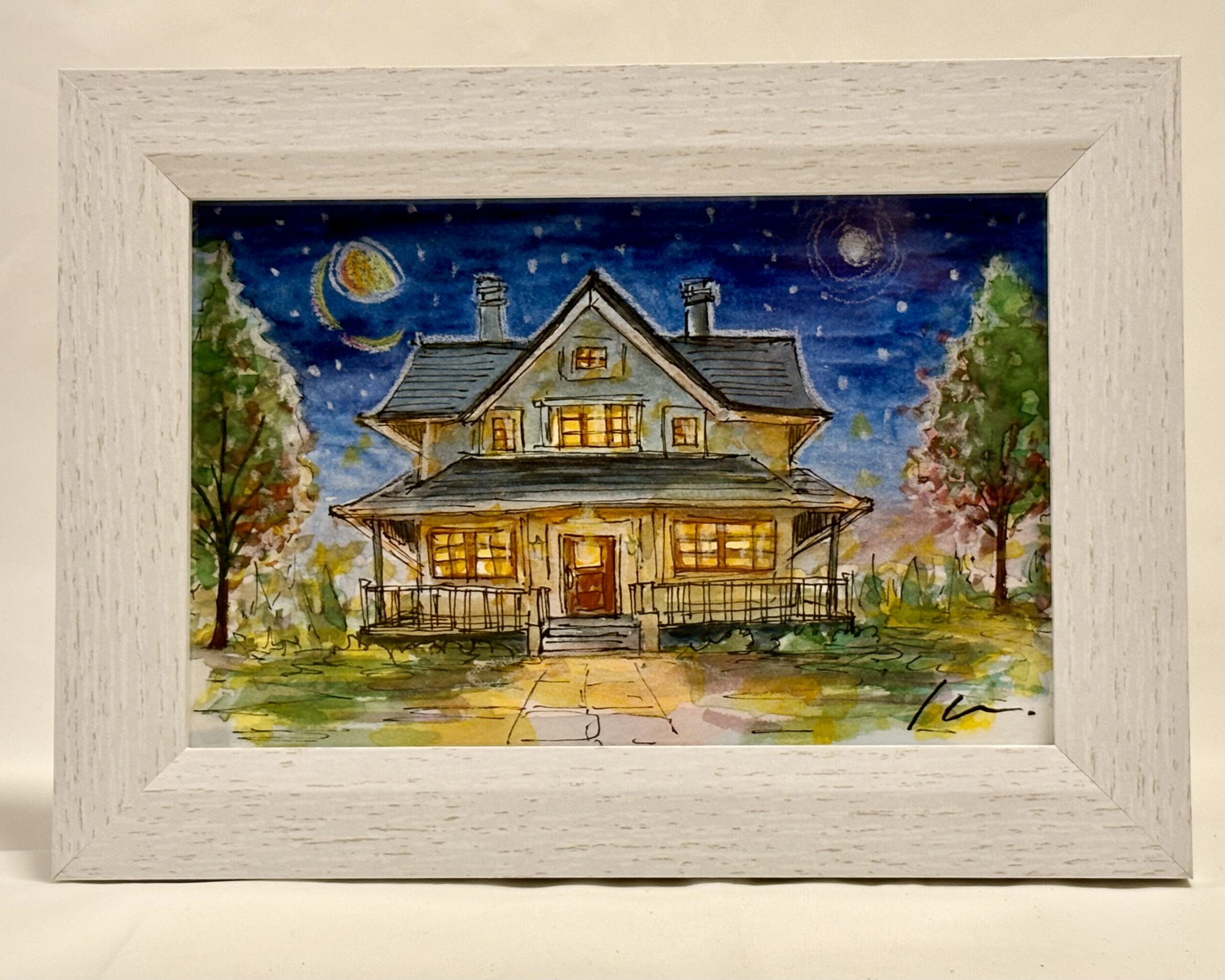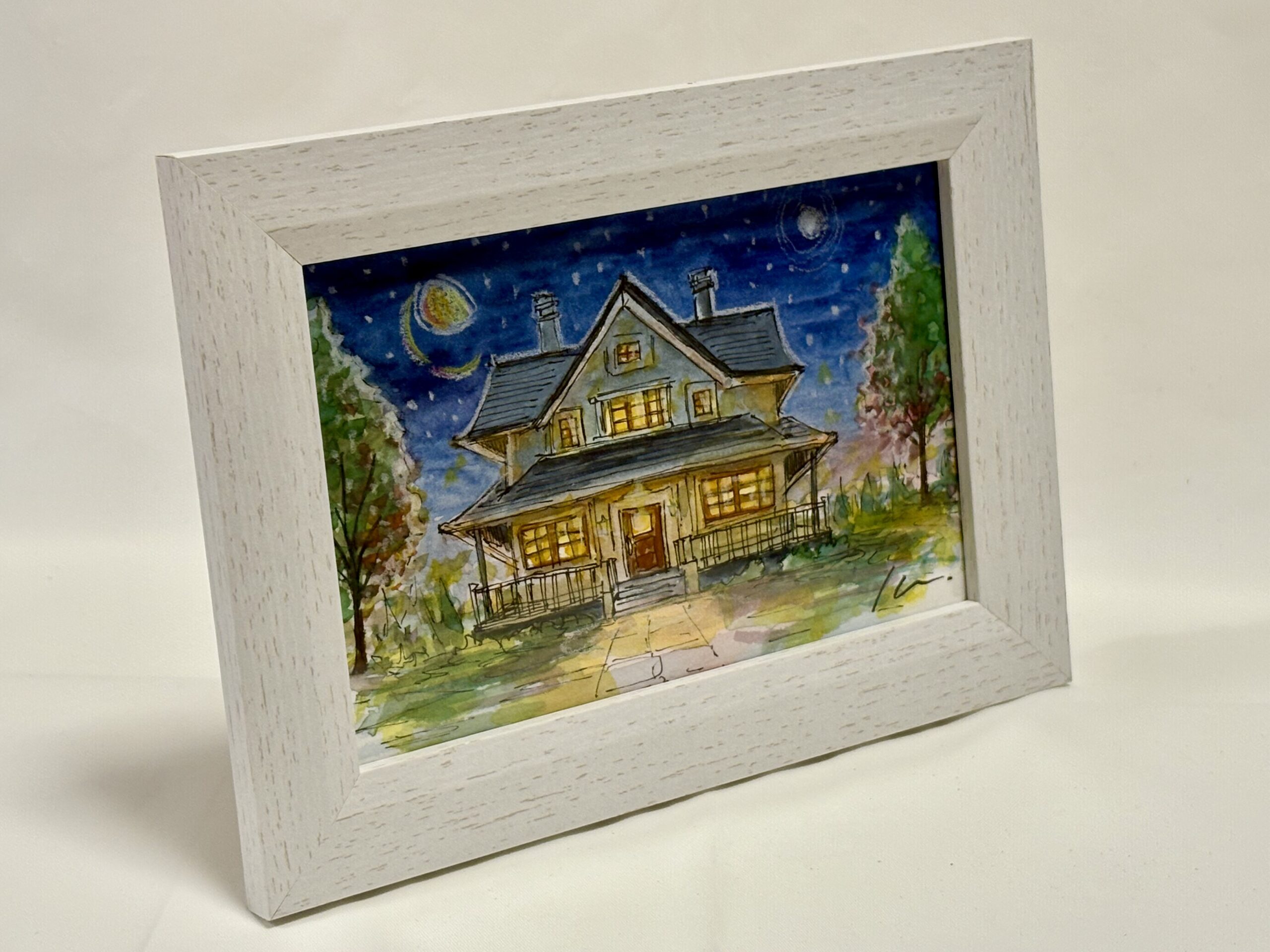 ポストカードサイズの作品原画です。夜空のなかお家の風景をスケッチしました。
